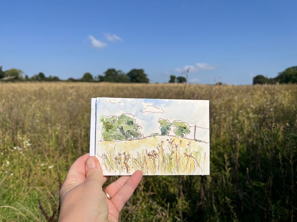 Some snippets from my little daily sketch journal - Top left: Moonslade field bird friendly seed crop fading from green to yellow. Top right - I designed a new logo for myself! Bottom left - a new art toy, a view finder… hoping this will help with my plein air sketching to help me frame a scene without feeling overwhelmed! Bottom right - one of my fave mugs :)