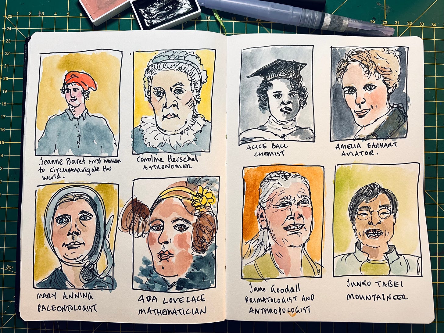 Artist in Residence Class: Every Sunday, I host an hour long drawing session called ‘Sketchbook Adventure’ where we do timed sketches of landscapes, flora and fauna from reference photos I curate from Unsplash. This week, I changed it up with a challenging "8 Portraits in 1 Hour" session to help members complete a portrait challenge by one of our lovely instructors, Linda Konya . Talk about a workout for the sketching muscles! It was great fun, and although my sketches weren’t perfect, it was a great exercise in practising the tricky art of portraiture!